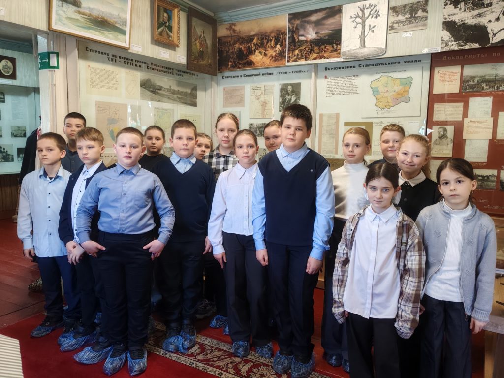 Краеведческий час «Летопись Стародуба» организовал 26 марта Стародубский краеведческий музей для обучающихся СОШ №3 2 «А» класса (классный руководитель Кучерявенко Т.И.). Ребята погрузились в атмосферу, наполненную героизмом, мужеством и стойкостью, которые стали основой нашей истории. Дети узнали, как благодаря труду и достижениям наших предков был основан и развивался Стародуб, как появлялись первые промышленные заведения: гуты и рудни, как защищали родную землю от врагов во все времена наши доблестные защитники. Юные посетители изучили предметы крестьянского быта: коромысло, цеп, лопату для выпечки хлеба, которые наполняли дома наших прабабушек и прадедушек. В ходе мероприятия ребята познакомились с военными экспозициями, а также с именами земляков, которые сыграли важную роль в развитии родного края. Группа юных экскурсантов оказалась особенной, так как среди них были праправнук Героя Советского Союза Ивана Ефимовича Москаленко — Саша Киржанов и правнук Героя Социалистического Труда Василия Степановича Нешкова — Кирилл Нешков.